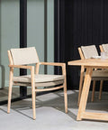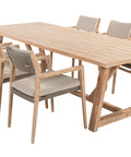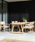 The Julia Dining Set with Noah Table from 4 Seasons Outdoor combines timeless mid-century design with lasting durability. This set includes six Julia Dining Chairs with brushed teak frames, taupe rope-like binding, and plush beige cushions, along with a spacious Noah 260cm Dining Table crafted from weather-resistant teak. Perfect for both indoor and outdoor dining, this set offers a sophisticated and comfortable seating solution for any space.