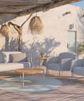 The Bernini Lounge Set with Coffee Tables adds luxury and comfort to your outdoor space. It includes two Bernini Living Chairs, a Bernini Living Bench, and a Yogi coffee table, all featuring soft cushions for ultimate relaxation. The sleek Frost Grey natural teak finish enhances the modern design, perfect for both unwinding and entertaining guests.