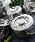 Offering superior 18/10 stainless steel, the AGA pans feature a completely encapsulated base which conducts heat evenly and quickly with an energy saving Superthermic wave profile base.