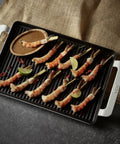 34cm x 23cm cooking area and 42cm x 24cm including wide branded handles