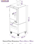 External oven: D:60 cm, W: 62, H: 185 cm (155cm without the chimney).