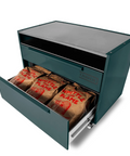 Materials: Stainless steel (top, shelf, interior); powder-coated exterior