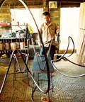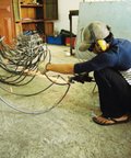 The frames are made in Phnom Penh by a small ironworking initiative and the rattan is hand woven in the town of Kampong Thom. In the forests where rattan grows, its economic value is helping protect forest land, by providing an alternative to loggers who forgo timber logging and harvest rattan canes instead. Design concept by Jimmy Mower.