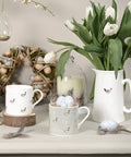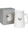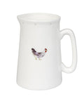 Treat yourself to one of our chicken fine bone china white jugs. A beautiful Speckled Maran hen sits on both sides of the jug with some small grey eggs around the outer rim.