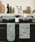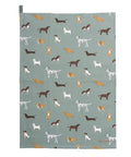 This (100% cotton) tea towel features illustrations of dachshunds, cockapoos, dalmatians, jack russells, west highland terriers, cocker spaniels, springer spaniels, British bulldogs and chocolate brown labradors on a sage blue background.